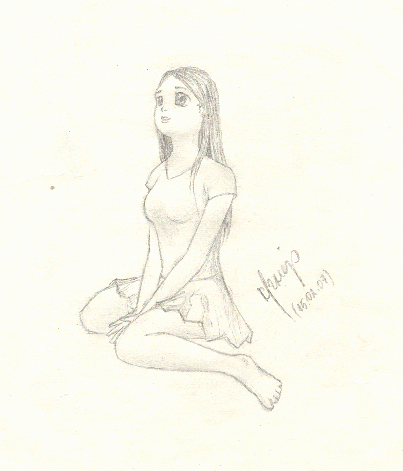 Zini, iistaa maaksliniece jau tagad esi tu un es buushu prieciigs par jebkuru izkraasotu skici. (*Klokjvaarpsta veel tagad leekaa apkaart par sho darbu) Bet, ja driikst luugt, es ljoti veeleetoos redzeet izkraasotu to peedeejo, seedosho meiteni ar tumshi bruuniem matiem, gaishu kreklinju un nedauzd tumshaakiem svaarcinjeim. Nezinu vai tas ir labaakais variants, jo mans istabas biedrs teica, ka vajagot kaut ko melnu ar sarkanu (melnus matus, sarkanu kreklinju?) Ja piekriiti, izmanto attachmenta bildi, jo taa ir labaakaa kvalitaatee, un ceru, ka pamaniisi, ka iskataas itkaa zem kreisaas rokas muguras liinija ietu uz aughu, bet patiesiibaa buutu jaaiet drusku sliipi pa kreisi (kaa zemaak), kjipa tur ir triis nevis divas matu liinijas. Bmp versijaa varbuut labaak redzams. Fonu gan nespeeju iedomaaties, bet jau atkal ceru uz tavaam iecereem.