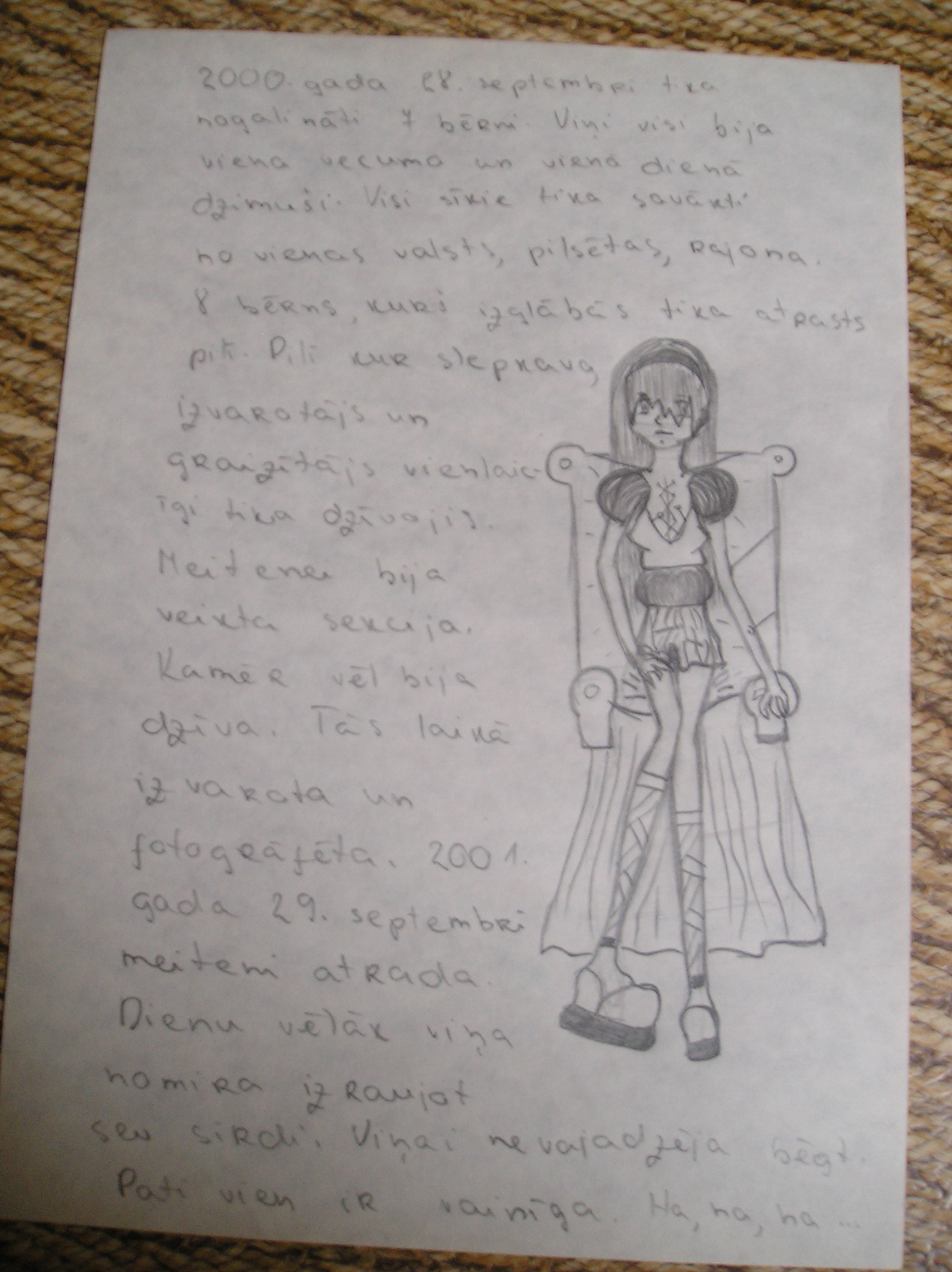 Pēdējam zīmējumam teksts bija tāds...nekāds. ''Un septītajā dienā meitene bez sirds sagraizīs,izvaros un apēdīs katru puisi vai meiteni,kurš iekļūs pilī.Un izraus sirdi.'' Texts baigi okultisks liekas...var pasmaidīt. Pats zīmējums arī pilns ar ķēpām. Paskaties tutorials,pameklē video un pazīmē līdz... -------------------- ![]() When you do things right,people will think you haven't done anything at all. |