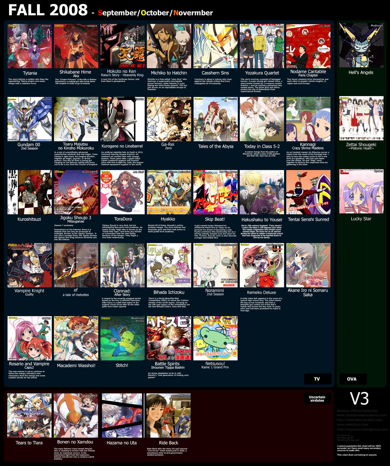 http://anidb.net/perl-bin/animedb.pl?show=...last.anime=Show <--- šis parasti pāris nedēļas pirms sezonas sākuma ir kaut cik precīzs, tomēr arī AniDB nesatur informāciju par visām anime, turklāt nereti nekā daudz vairāk par nosaukumu un mēnesi, kurā to visticamāk rādīs, arī nav.